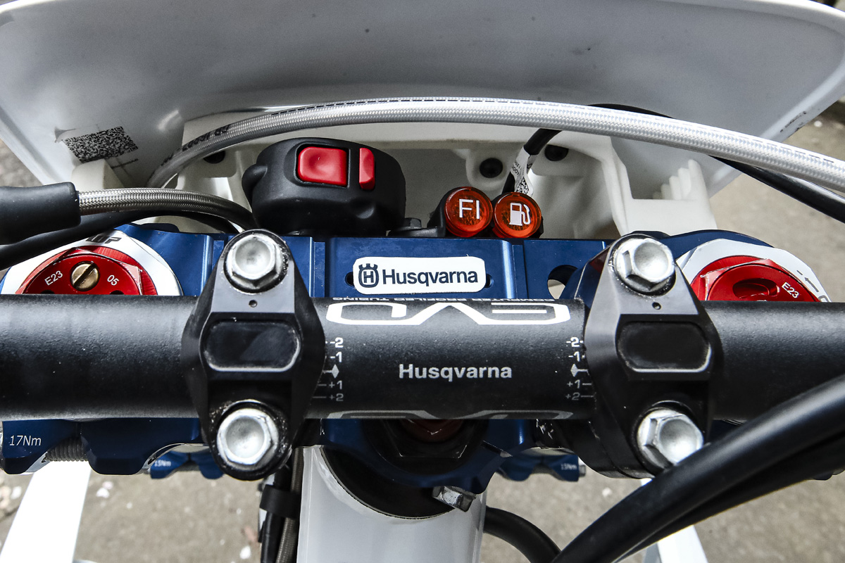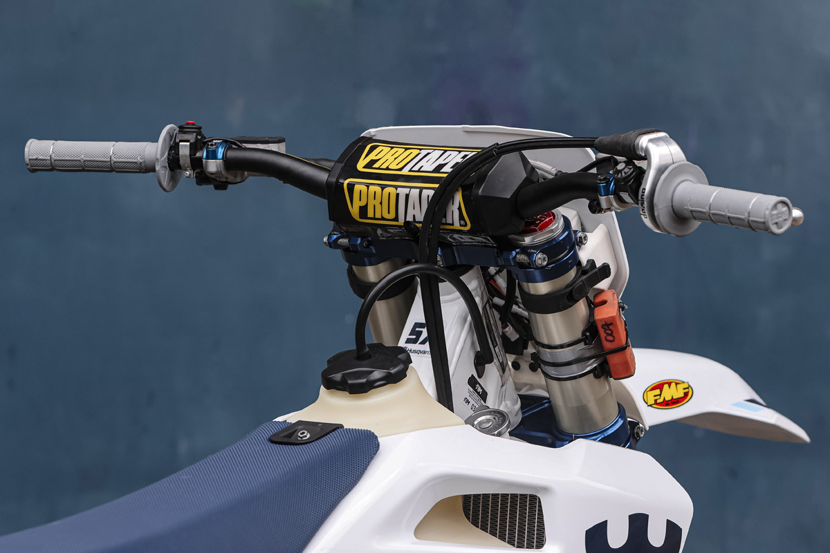 The frame and geometry are standard FE 350 — nothing special or modified as some previous champions have used. The Husqvarna Technical Accessories triple clamps are off-the-shelf and unchanged in ‘26.