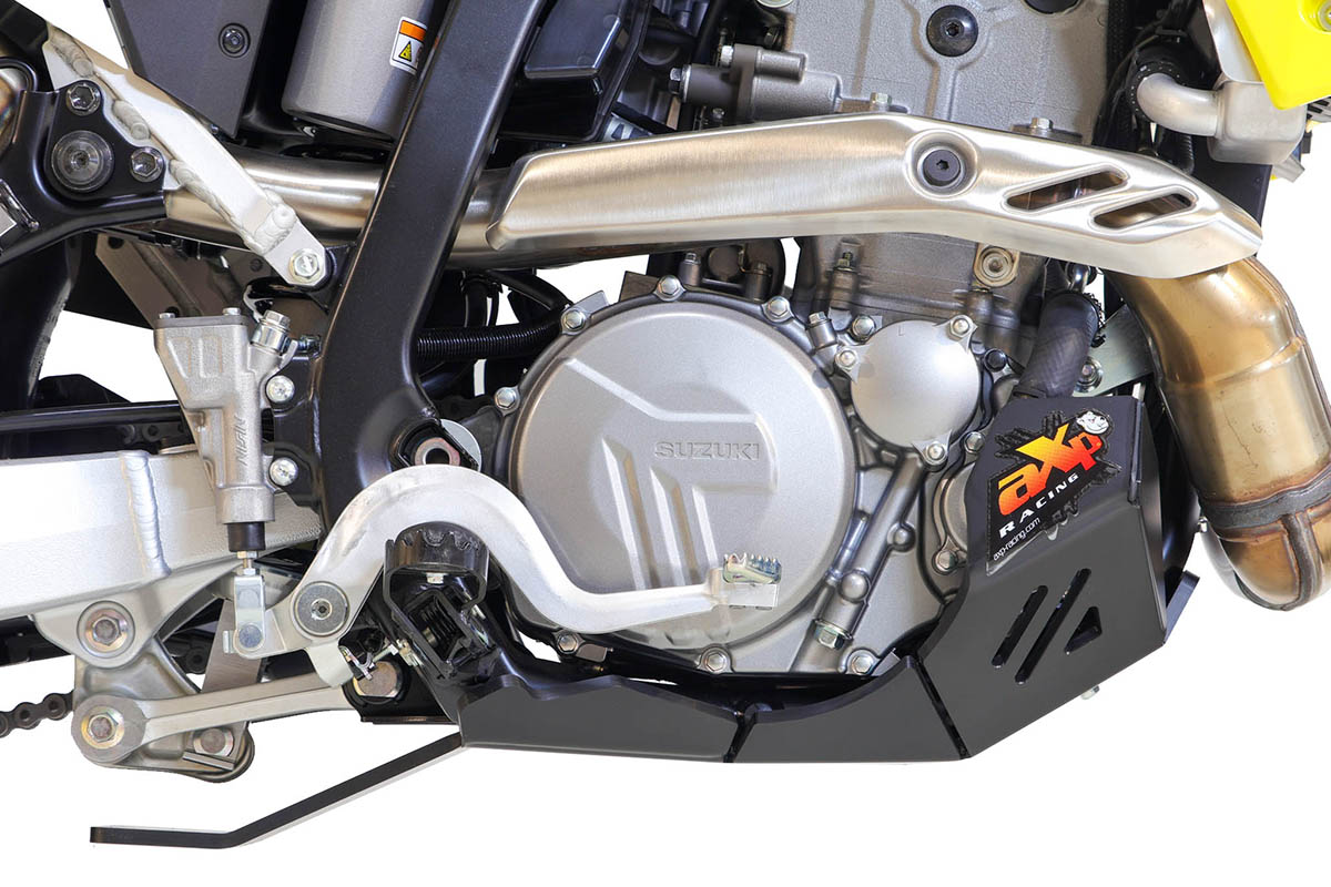 AXP Racing develop new, lightweight, high-density skid plate for the Suzuki DR-Z4S dual-sport bike to protect engine cases, water pump, suspension linkage and lower frame on the revived off-road icon.