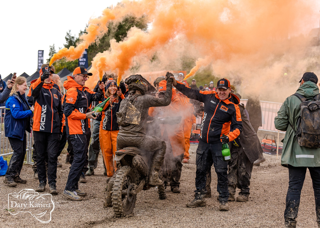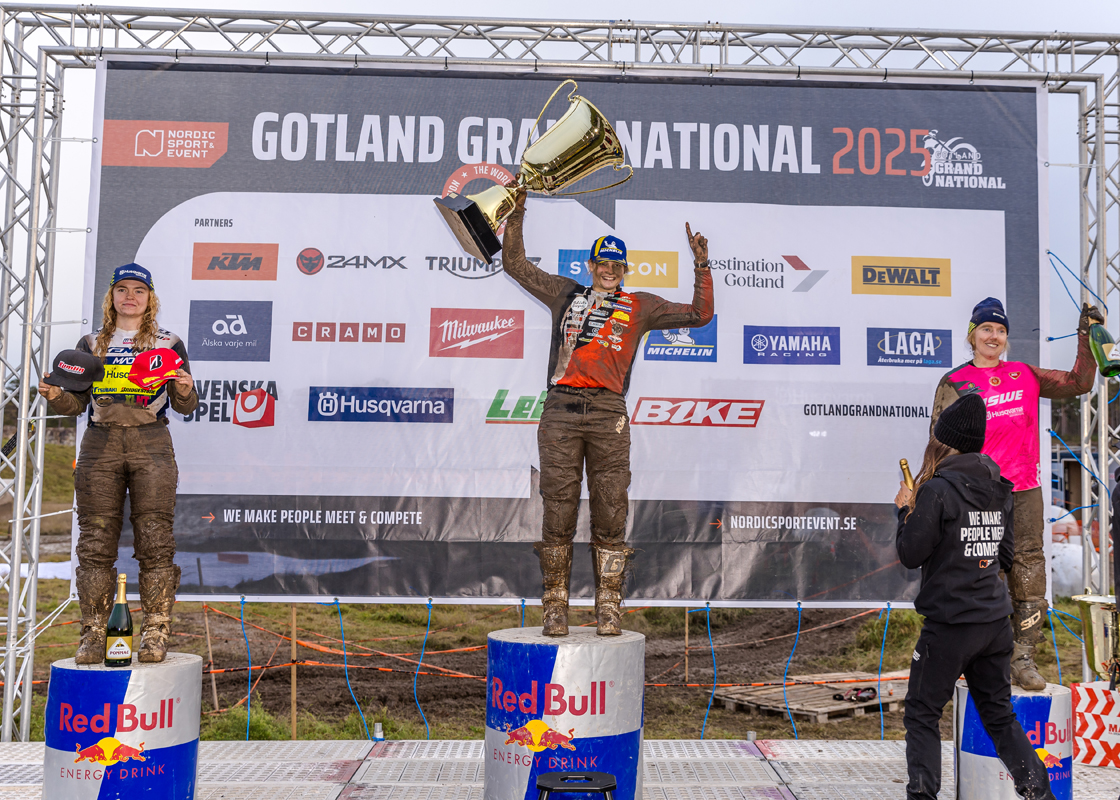 Swedish EnduroGP World Championship riders mob the mucky podium at the epic 2025 Gotland Grand National with third victory for Max Ahlin in unreal conditions.
