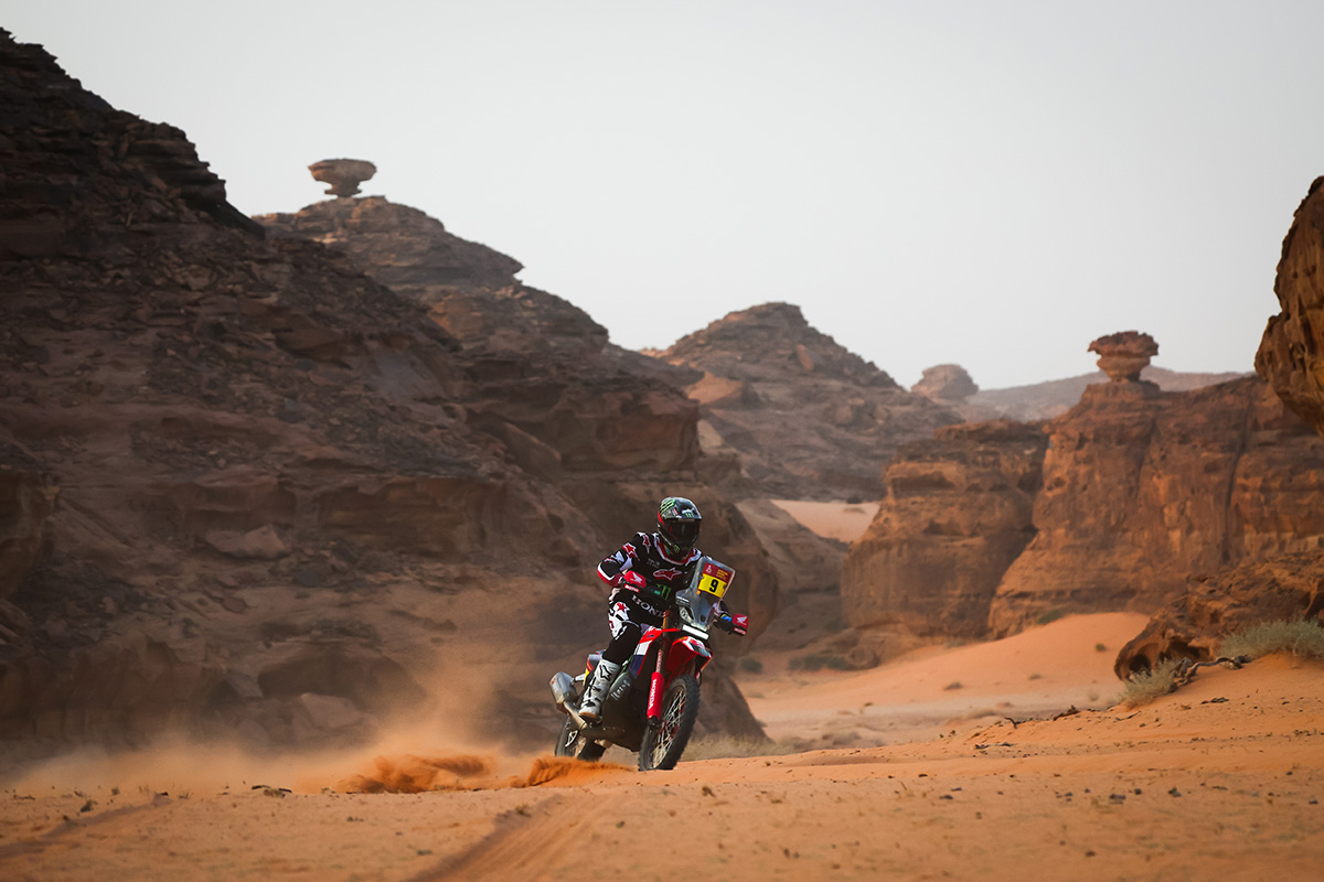 2026 Dakar Rally stage three results sees Monster Energy Honda take a confident one-two with Tosha Schareina claiming victory (despite a crash!) ahead of Red Bull KTM’s Daniel Sanders heads a long day out front to maintain the overall lead.