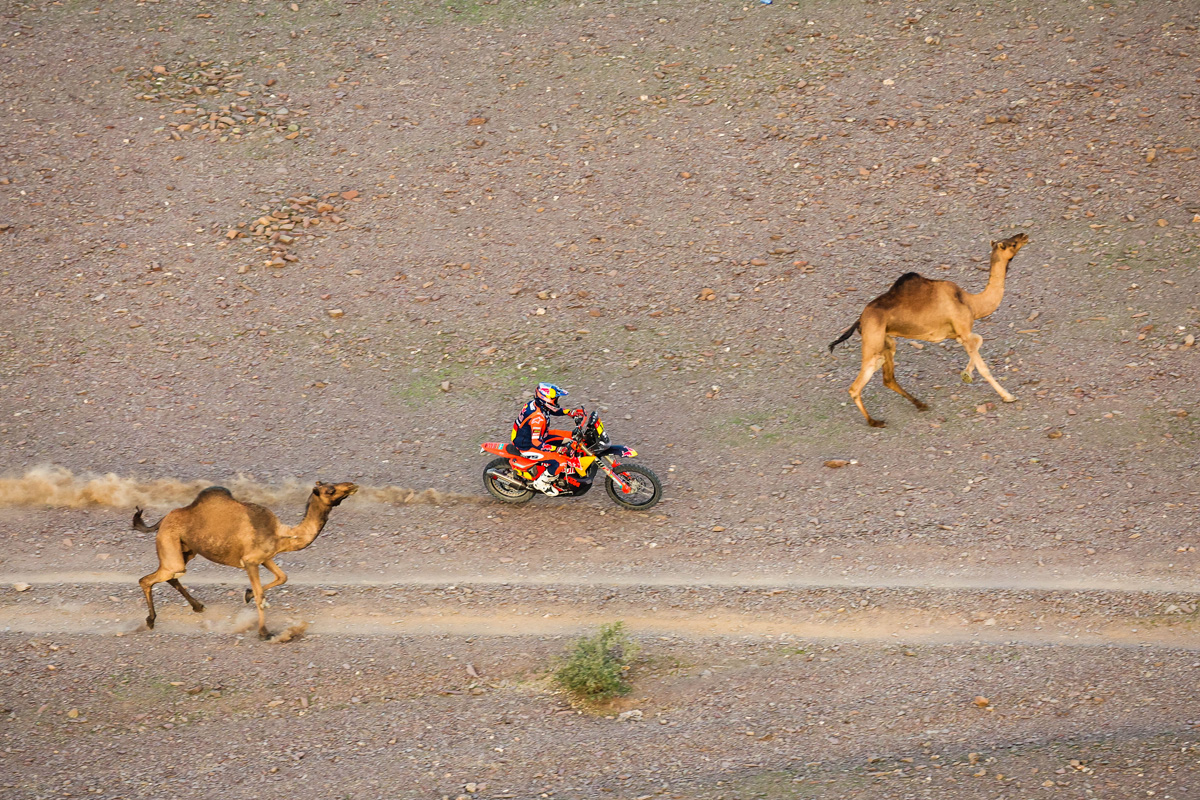 The story of the day in a nutshell is stage one winner Edgar Canet led everyone away but made mistakes early, including having some camel issues, which allowed teammate Daniel Sanders to catch up on the trail and the KTM pair continued to ride in tandem out front for most of the stage, amassing crucial bonus time in the process.