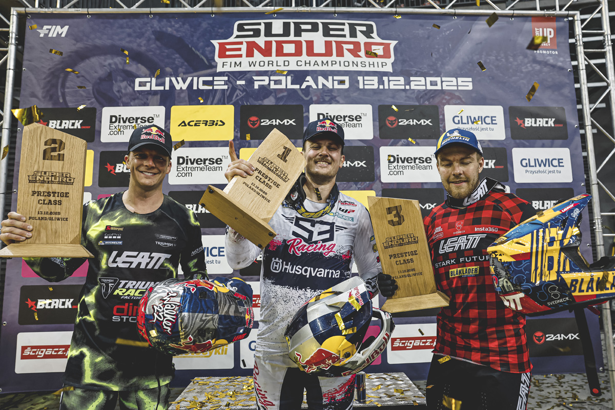 Billy Bolt opened his 2026 SuperEnduro World Championship campaign in dominant fashion in Gliwice, Poland, but not without pressure from a fired-up Jonny Walker on the Triumph. Eddie Karlsson completed the podium to claim a first overall for both himself and Stark.