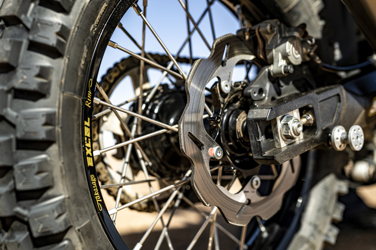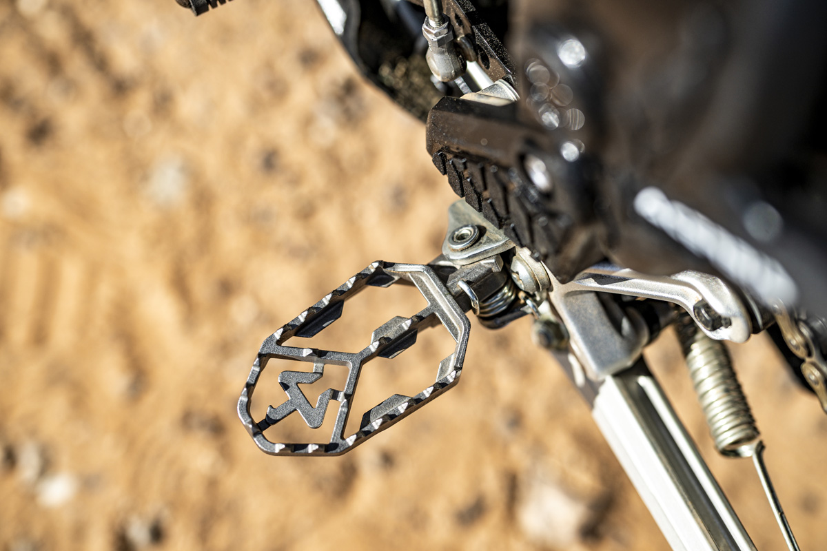 It’s a long list but stretches through everything from increased power, reduced weight in the engine and chassis, tuned ECU, the race bodywork and fuel tanks, handlebars, footpegs, exhaust, air intake, the upgraded suspension, clutch and brakes, plus the rally-raid tower and race wiring loom, switches and lights.